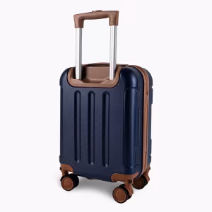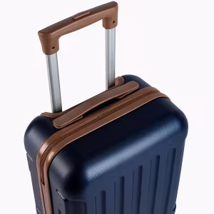 Detaliu rafinat: corp în culoarea albastru închis și fittiguri în maro ciocolatiu — fermoar, roți, mâner. Contrast elegant și unic.